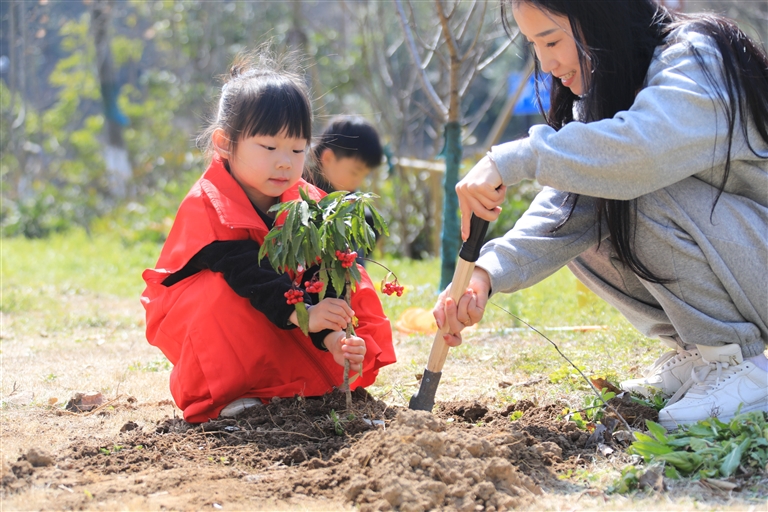 昨天,定海区昌国街道开展“我在云廊‘种春天’”植树节亲子活动。活动现场,家长和孩子共同栽下“亲子树”,系上心愿卡,体验植树劳动的乐趣。记者 陈永建 通讯员 黄钰婷 摄