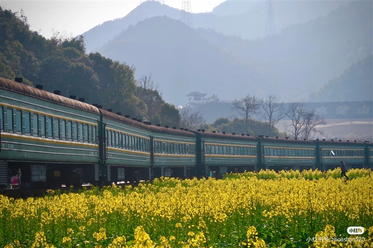 定海南洞艺谷的油菜花田位于艺谷的火车广场。复古的绿皮火车旁,一道又一道田埂上种满了油菜,近处是黄绿相间的花田,远处是白墙黑瓦的民居和青山云岚,不论是置身花海还是上车隔窗拍摄,都能捕捉到浓郁的乡野风情。如果有精力,还可以继续往上走到水库大坝,这样可以拍到火车和花田的全景。
