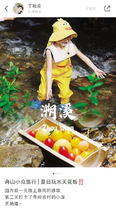 通过这种方式,丁欢也意外带火了舟山的几个小众景点。去年夏季,溪坑纳凉在舟山火了一把,丁欢看到一个户外运动爱好者发了一组寺岭村山间溪涧的旅途分享,一家子就打算前去一探,“那里的路车子很难开,我们差点就要放弃了。最后找到的时候真的很惊喜,因为前一天刚下过大雨,溪流的水位很高,看上去居然神似温州的百丈漈,溪中有鱼有虾,上面还有一座清代古桥,我们完全没想到在舟山还有这样的溪流。”丁欢在小红书发布了溪坑纳凉的笔记,网友们纷纷在底下询问纳凉路线,溪坑纳凉也一度成为舟山去年夏季的热点。