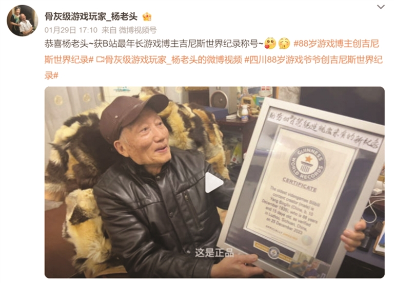 2024年1月29日,杨炳林收到一张吉尼斯世界纪录证书,他被正式认证为“最年长的B站游戏博主”。他把证书与妻子的照片装裱在一起,提笔附言“勤劳加智慧,能造就出未有的新纪录”,老派而硬汉。
