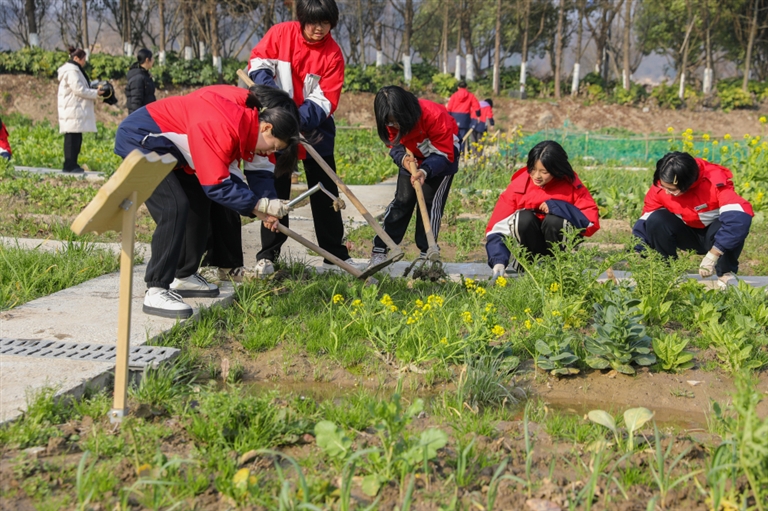 春光正好,普陀二中城北校区的农耕体验研学基地呈现出一派生机勃勃的景象,蚕豆、青菜、西蓝花、蒜苔、土豆等庄稼长势喜人。学生们临时化身“小菜农”,兴致勃勃地清理杂草,拾捡垃圾,体验农耕劳动的乐趣。 通讯员 陈佩君 摄