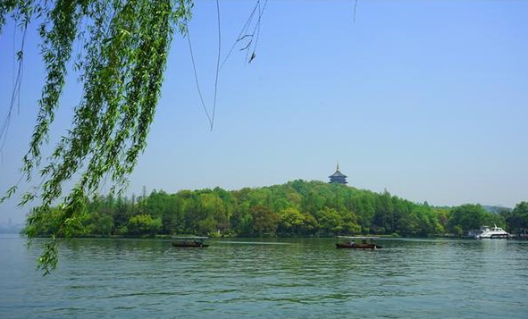 湖边垂柳依依,湖中画舫缓缓。水如一面明镜,倒映着青山绿水,又似一块碧玉,温润着诗画江南。风轻云淡,天边是一方朦胧,水天相接之处是一方淡雅。“水皆缥碧,千丈见底;游鱼细石,直视无碍。”西湖之水悠悠,洗涤着我的心灵。愈往前走,愈是一片暮春的美丽景象。花儿争奇斗艳,桃花上还带着露水,披着薄薄的白雾。在氤氲之中,又有些许羞怯。