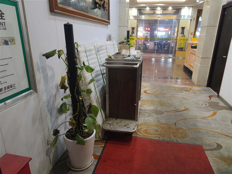 ●舟山市金鹤置业发展有限公司梅园宾馆 火灾隐患: 一层楼梯间堆放杂物