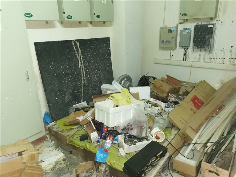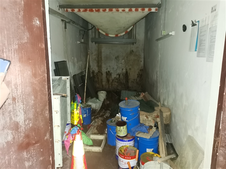火灾隐患: 配电间及风机房堆放大量可燃物