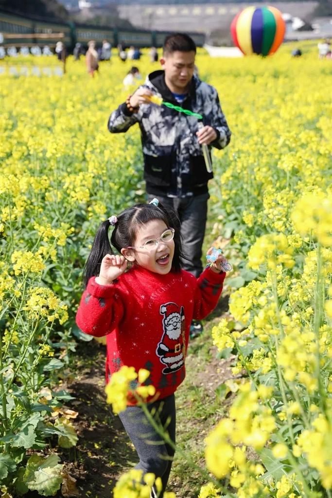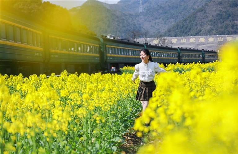 南洞艺谷的油菜花开得正好,大片的油菜花田,旁边颇有特色的房屋,白墙黛瓦,错落有致,一派乡村野趣之景。墨绿色的“功勋号”火车蜿蜒在花田一侧,像是恰好行驶在春天里。