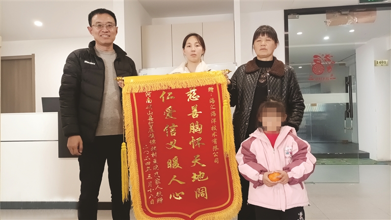 孟瑞和婆婆向于晓龙深深鞠了一躬。“太感谢你们了,多亏了你们的资助,不然我们的日子根本过不下去……”孟瑞给于晓龙送上一面写有“慈善胸怀天地阔,仁爱信义暖人心”的锦旗表示感谢,还递上了一个大大的编织袋。