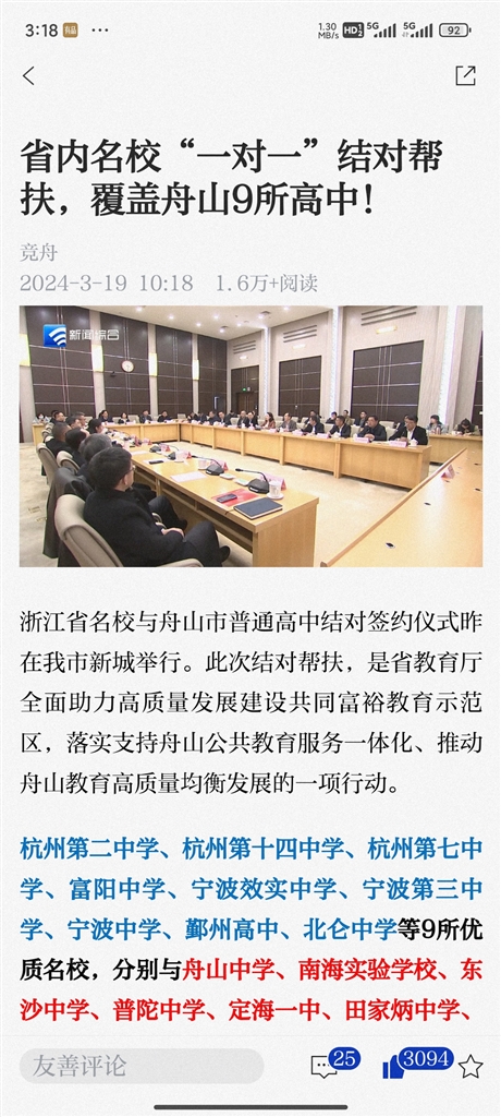 18日下午,来自全省9所优质名校与我市9所普通高中“一对一”结对,助力我市海岛教育高质量发展(《舟山晚报》3月19日报道)。我市成为全省唯一普通高中与省内优质名校结对帮扶全覆盖地级市,真让人喜忧参半。