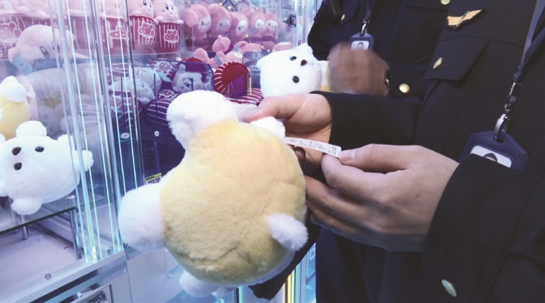 在新城宝龙广场2楼“星际梦想城”电玩店,绝大多数娃娃机里的毛绒玩具都有标签,上面标注了厂名厂址、原料配料等规定信息;但有两只大型娃娃缺少标签,执法人员立即下发了责令整改通知书。