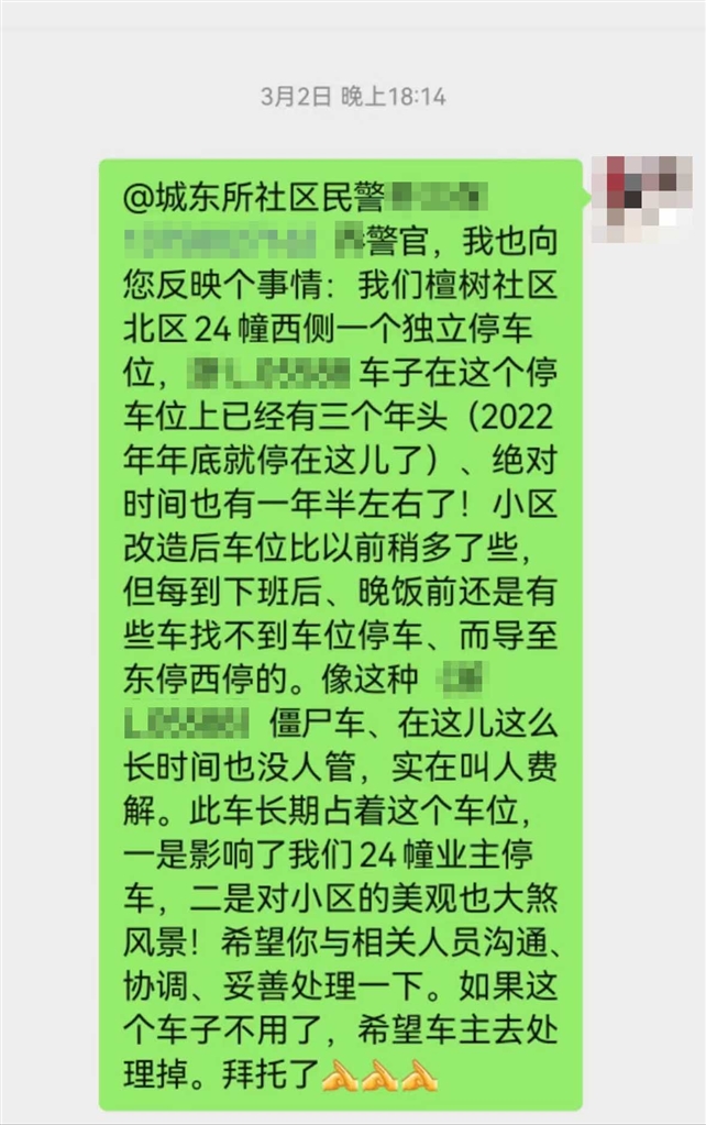 高先生告诉记者,他家住在24幢,这个车位刚好就在他家楼下,平时进进出出总能看到这辆车,所以就特别关注。去年5月,他看这辆车停在这里大半年了,就联系了定海檀树社区的工作人员,想让社区帮忙联系一下车主,“我联系社区后,工作人员当天就告诉我,车主也是小区业主。”