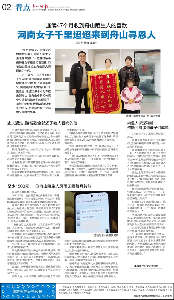 3月19日,在普陀东港的海汇海洋工程技术(舟山)有限公司,来自河南省确山县留庄镇的29岁女子孟瑞和58岁婆婆刘四群、4岁女儿贝贝,终于见到了近4年来连续每月给她微信转账1500元爱心款的“神秘恩人”、该公司总经理于晓龙(《舟山晚报》3月21日报道)。特别的爱献给特别的你,这段佳话感人至深。
