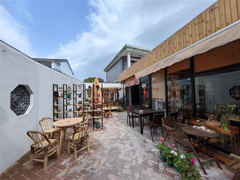 走进“听陶”,入目的是一方小庭院,木质桌椅随意摆放在其间,四周随处可见漂亮的花草,这些是店员的精心布置。而院中墙上逼真的木雕黄鱼和古朴凉棚则是丁朝夕的手笔,“庭院是我设计的,装修我也全程参与。比如这个凉棚就是我自己亲手做的,用了榫卯工艺,没打一根钉子。所以它看上去没有支撑但却立得稳,有种似空非空的感觉。”
