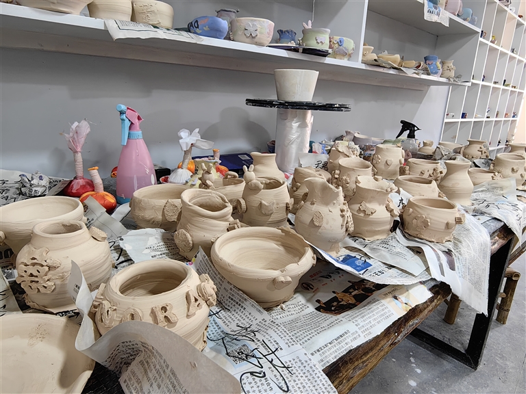 “问石”与“听陶”的店主丁朝夕是名艺术家,醉心工艺美术二十余载,和石雕、陶艺等打了多年交道,是国家一级雕刻师。“我早年在东港一带开艺术工作室,后来看到了路下徐文化产业发展的潜力,就在2021年前后来这里筹备了以石雕为特色的‘问石’,去年下半年又有了这家‘听陶’,主打陶艺制作。”他说。