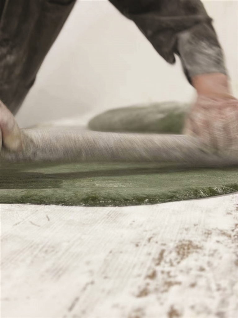 之后就是正式开做。如果是做麻糍,就把这些青色的糯米团儿合拢,变成一个大面团,随即拿过擀面杖擀薄,摊成一张“大饼”。搁在边上晾凉以后,剪开来就是麻糍了。