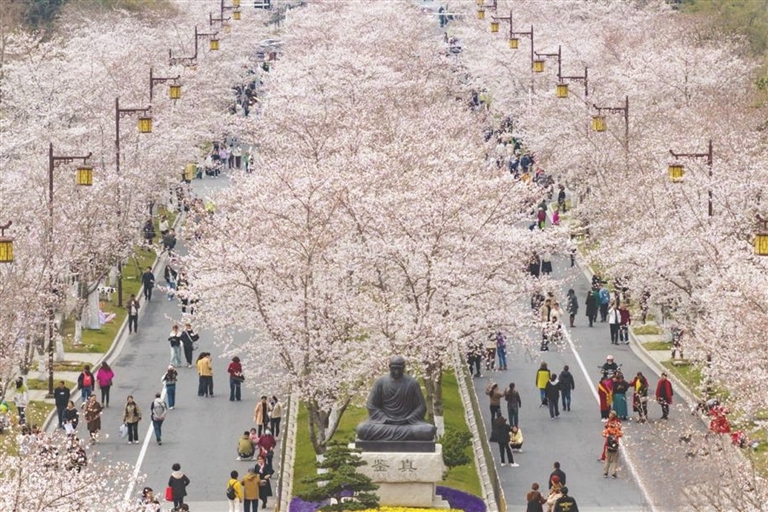 3月26日,江苏扬州鉴真路樱花盛放,吸引民众前来观赏。鉴真路位于扬州鉴真图书馆西侧,2010年底,该市迎接日本东大寺鉴真坐像回乡“省亲”时开通,因遍植樱花,被当地民众亲切地称为“樱花大道”。图为扬州鉴真路上的樱花迎来最佳观赏期。 中新网 图