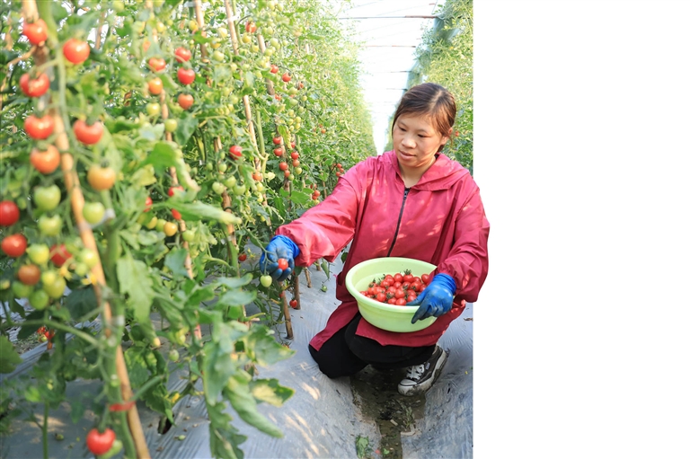 近日,在普陀区展茅街道横街村一果蔬大棚内,种植户罗秀红正在加紧采收小番茄。据了解,这里的水果主要供应本地批发市场,供不应求。 记者 陈永建 摄