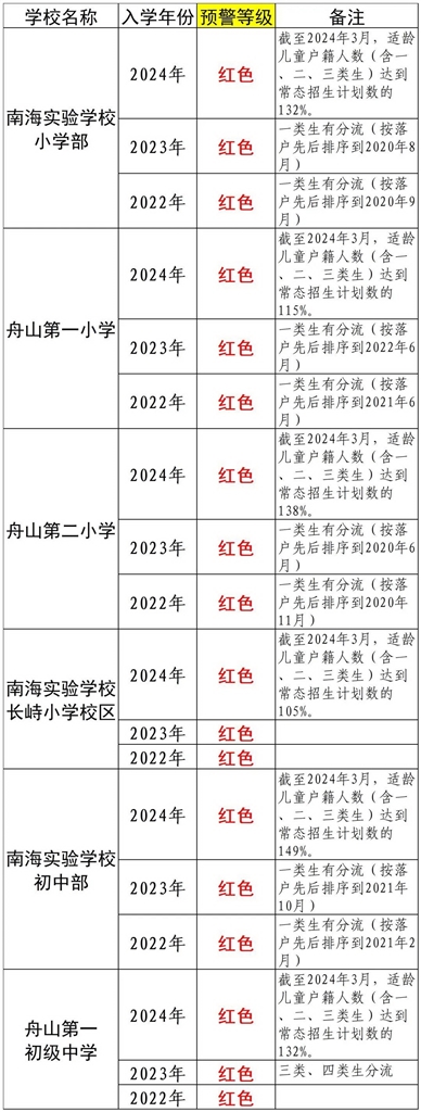 注:根据历史录取数据,南海实验学校小学部、舟山第一小学、舟山第二小学2022年、2023年一类生均有分流;南海实验学校初中部2022年、2023年一类生有分流;舟山第一初级中学2023年三类、四类生分流。2024年招生录取情况受当年实际报名情况影响,历史数据仅供参考。