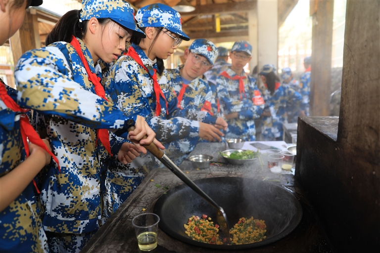 近日,在定海区干石览镇的市红领巾少年军校综合训练基地,来自全市各地的45名少先队员开展炊事班厨艺大比拼活动。学生们通过洗菜、配菜、炒菜等展示厨艺。记者 陈永建 摄