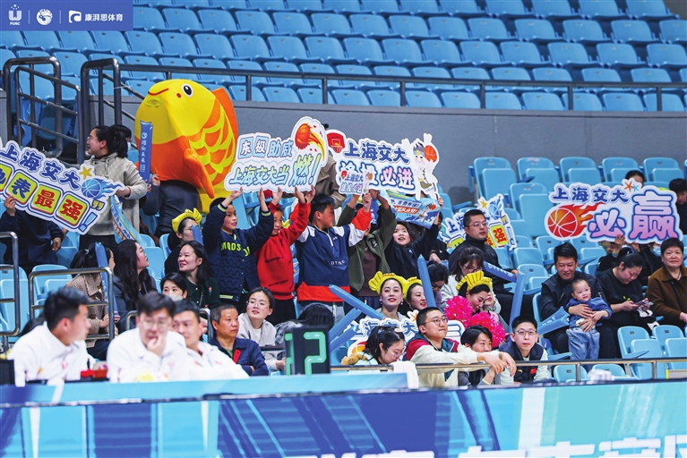 亲友团们也纷纷“组团”来到普陀,为孩子们加油助力。观众席里,上海交通大学篮球队18号队员吴尚谕的爸爸和其他亲友团们,手持交大横幅,热情洋溢地摇旗呐喊,他说:“希望通过这样的方式,让他们感受到来自家人的支持与鼓励。”