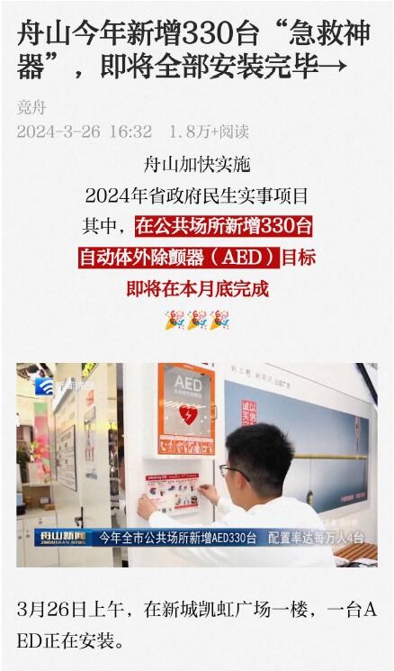 公共场所新增AED配置首次被列入省政府民生实事项目后,我市2024年目标任务是新增330台AED配置。本月底,我市可全部完成安装配置,同时完成1650名救护应急人员的AED培训(3月28日《舟山日报》报道)。