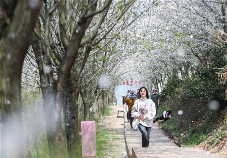 4月1日,定海小沙街道光华村鲍家,樱花谷里大片樱花绽放,慕名而来的市民游客正在树下打卡拍照。今年樱花谷增设了业态小屋、上山道路及木栈道等,市民游客能多角度欣赏樱花。
