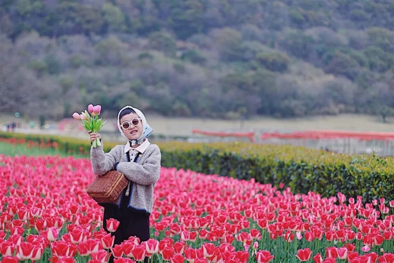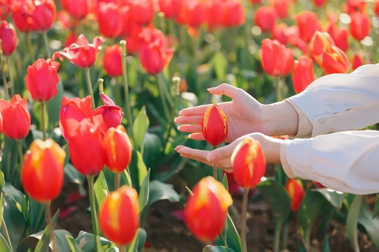 郁金香好看,也好拍。翻一翻小红书,就能收获不少在郁金香花海中的大片。低头轻嗅花香,任由微风轻轻吹起秀发,或是静静坐在花海前,柳叶低垂,花开静好,单单一个背影也有着绝美意境。