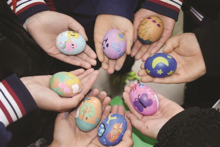 “清明蛋”是山东多地的民俗传统。人们将鸡蛋煮熟后,用各种颜料绘制出精美的图案,寓意着吉祥如意。活动现场,孩子们用丰富的想象力和灵巧的双手在鸡蛋上画出人物、动物、花朵、卡通形象等各式各样的图案,感受传统文化魅力。中新网 图