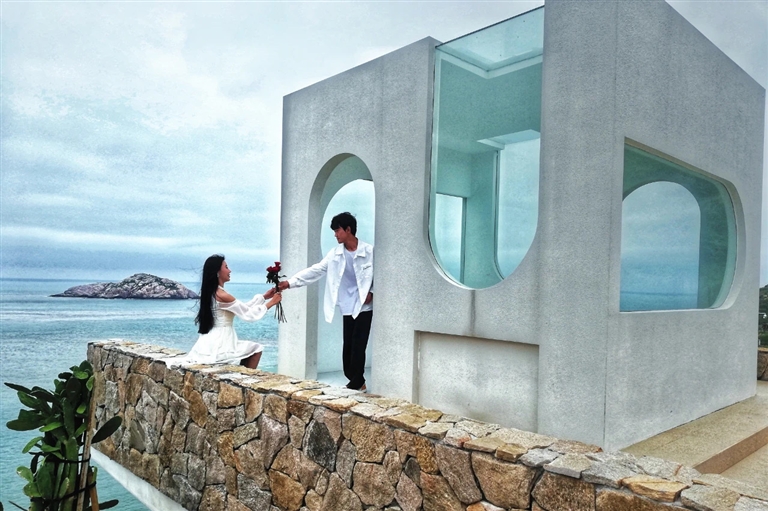 在花鸟乡政府工作人员刘畅乔的指引下,记者来到了岛上最浪漫的地方——花鸟岛户外结婚登记颁证基地。步入用民居改造的“花栖鸟”颁证基地,抬头可见飞鸟贺喜,四周鲜花簇拥,转头望向屋外,只见蓝天碧海间的“纸短情长”证婚广场,一张巨大信纸造型的雕塑立在其中,上面刻着“所爱隔山海,山海亦可平”。不远处,还有同样拥有浪漫气质的“写一封情书”致爱书房和“晚风”广场、观海走廊等建筑。