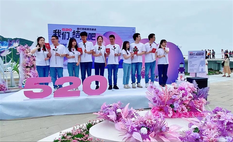 去年5月20日,10对来自全省各地的情侣在花鸟岛户外结婚登记颁证基地登记结婚并向着花鸟灯塔宣誓,开启全新的人生篇章。