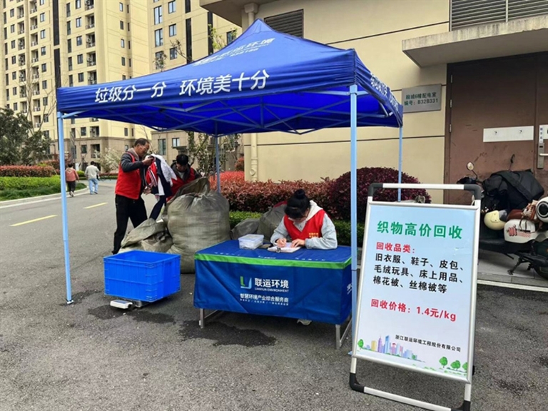 4月7日,浙江联运环境工程股份有限公司的旧衣物回收摊位在普陀美的翰城小区“开张”了,醒目的告示牌上标明了回收品类和回收价格,吸引了不少居民前来咨询。“现在换季了,这个摊位太及时了!不然旧衣服扔又舍不得扔,放又没地方放。”居民章女士拎着两大包衣服说道。
