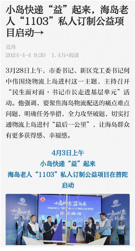 4月3日上午,小岛快递“益“起来,海岛老人“1103”私人订制公益项目在普陀启动。用一句话解释“1103”,就是“1个”社会组织、“10支”志愿队伍为10个小岛的老人在“3小时”内完成快件投递。