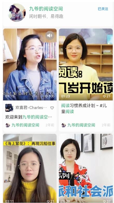 “于我而言,读书是生活的一部分,如同吃饭睡觉是生活的乐趣……”2021年4月15日,九爷在个人微信视频号“九爷的阅读空间”产出了第一条介绍视频,而后陆续开始发布书籍推荐视频,目前累积了40个作品。视频里,九爷推荐好书,介绍文学知识也分享阅读方法,有时她也会结合热点话题输出观点,风格平实而理性。