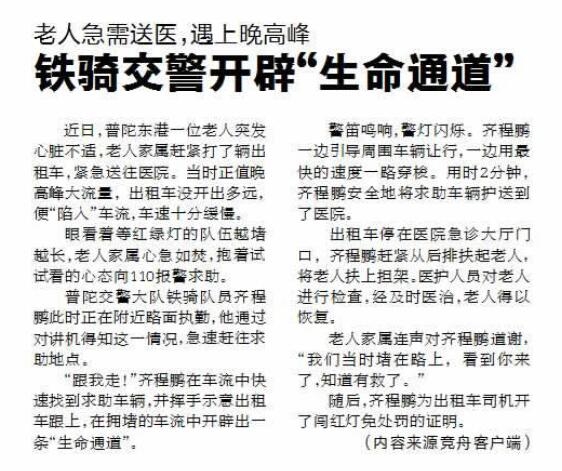 普陀东港一位老人突发心脏不适,打的送医却堵在路上,家人向110报警求助。交警铁骑队员齐程鹏在拥堵的车流中开辟“生命通道”,仅用2分钟就到达医院,并将老人扶上担架(《舟山晚报》4月9日报道)。警笛声声、警灯闪闪,为生命开道的铁骑好不威风!