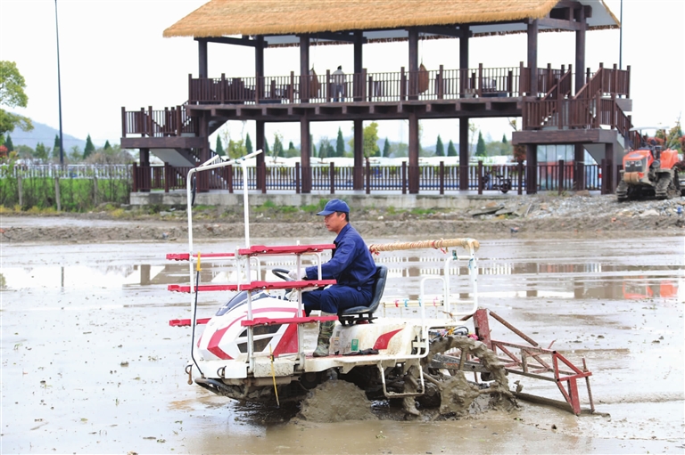 近日,在定海区马岙街道团结村田畈上,当地的种植户正驾驶农机翻耕农田。时下正值春耕生产时节,农民们抢抓农时,春耕备种,全力保障早稻稳产增收。记者 陈永建 摄
