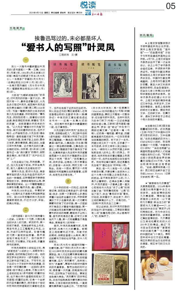 4月10日发表于《舟山晚报》的《“爱书人的写照”叶灵凤》一文中,陈时杰描述了自己重读叶灵凤《读书随笔》时回忆起的多个“第一次”:第一次看到那么多通俗易懂介绍名家名著的文字;第一次对藏书票藏书印有了印象;第一次了解并不是自己才喜爱书里的插图;第一次知道如何去甄别藏书家和爱书家……“书对我来说就是人生记忆的承载物,记忆无处可寻是一件很可怕的事。”他说。