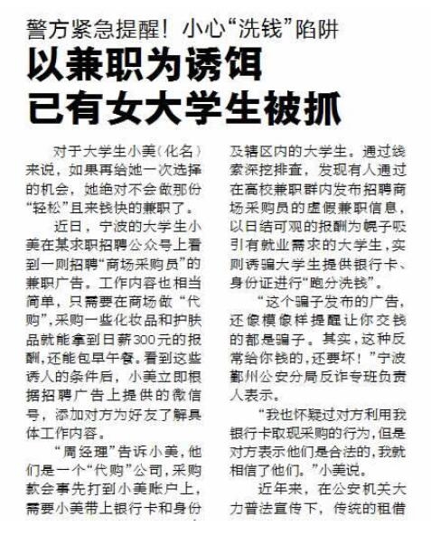 有人通过在高校兼职群内发布招聘商场采购员的虚假兼职信息,以日结可观的报酬为幌子吸引有就业需求的大学生,实则诱骗大学生提供银行卡、身份证进行“跑分洗钱”。近日,3名宁波的大学生因参与兼职代购,提供“两卡”信息给犯罪分子“洗钱”,被警方处以罚款并处没收违法所得的行政处罚(《舟山晚报》4月16日报道)。