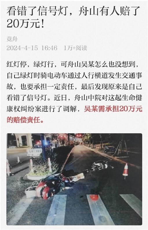 吴某之所以会“看错信号灯”,是因为这个路口只有机动车和人行横道信号灯,而没有非机动车信号灯,骑电动车的他想当然地“认领”了人行横道信号灯,而这恰恰是错误的选择。按照道路交通安全法规定,骑行非机动车经过未设置非机动车信号灯路口时,应当按照机动车信号灯指示通行。这一错,竟要付出20万元的代价,吴某想必连肠子都悔青了。