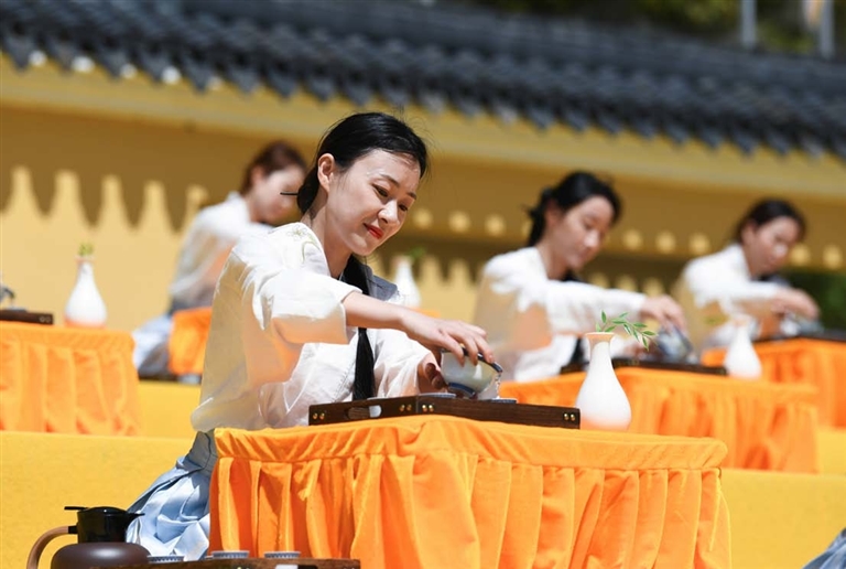 昨天上午,第十六届普陀佛茶会在东港塘头佛茶园举行。活动现场,茶香四溢,禅意悠长。来宾们围炉煮茶,闻香品茗。台上,各种茶艺表演、音乐演奏、插花艺术等环节交相辉映,呈现了一场视觉与味觉的盛宴。台下,茶艺师们向来宾敬上三道普陀佛茶,让他们近距离感受普陀佛茶独特品质。