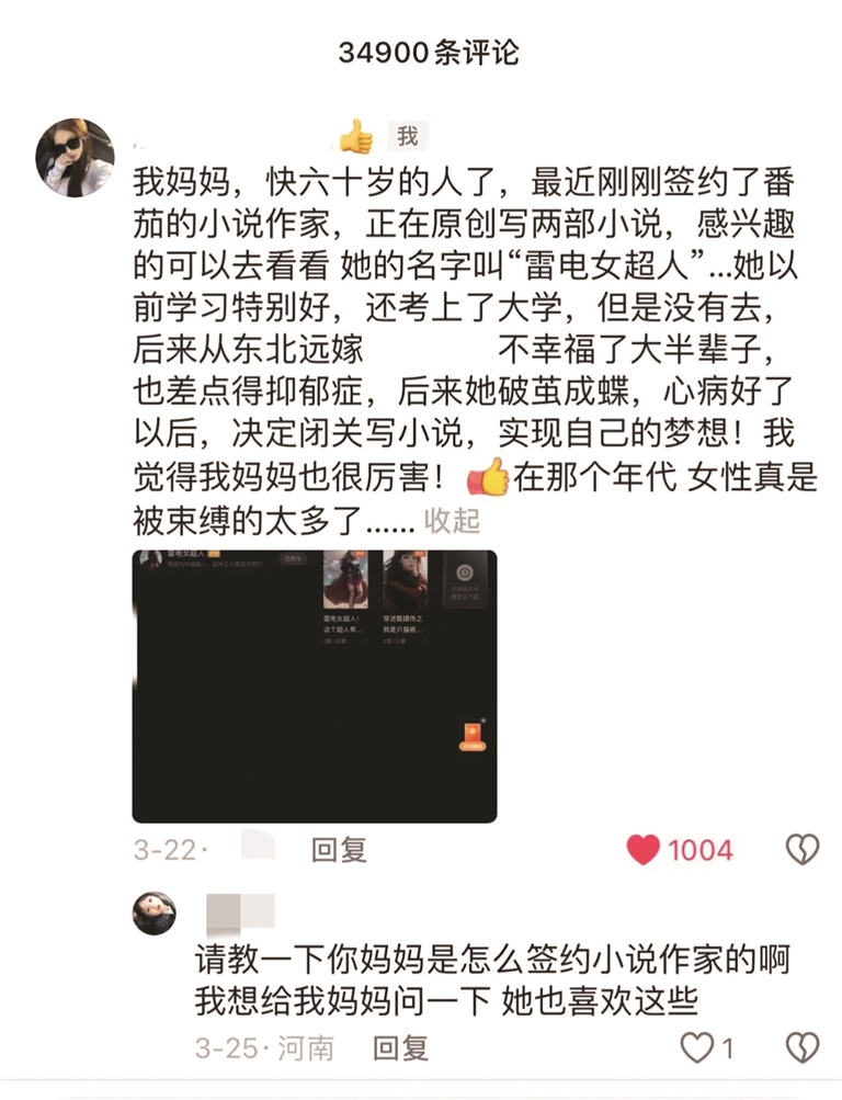 女儿分享的社交动态很快收到千人点赞,大家从飞扬身上看到了她那一代女性的一种生活样本:她们年轻时也热爱写作,但为家庭所累,将梦想搁置,如今退休后重获闲暇时光,大家希望自己的妈妈也能像飞扬一样,从被消耗的日常家务中挣脱出来,重新拿起笔,实现未竟的文学梦想。