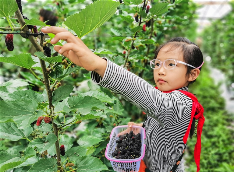 定海马岙现代农业园区内的桑树长势良好,一颗颗鲜嫩诱人的桑葚挂满树头。昨天,前来采摘的市民游客络绎不绝。记者 张磊 摄