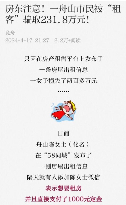 小偷少了、骗子多了,这也应该是“互联网改变世界”的一个方面。而在道高一尺魔高一丈的较量中,各类骗术也在不断花样翻新,一不留神就会有人中招。就如这起骗案,“租客”先以主动支付1000元定金博得陈女士好感,又让陈女士在代管“投资平台账号”中对收益“眼见为实”,然后再“欲取先予”让陈女士尝到诱饵的甜头,就这么一步步引君入瓮直至阴谋得逞销声匿迹。