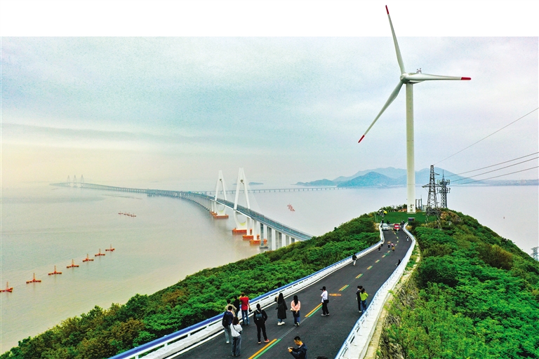 4月20日,定海马目宫前村,通往舟岱大桥观景平台的道路焕然一新,市民们纷纷前来领略风车海景。这条长约2.5公里的砂石路原本是仅用于建设风力发电的施工便道,如今已成“最美”风车公路。记者 张磊 摄