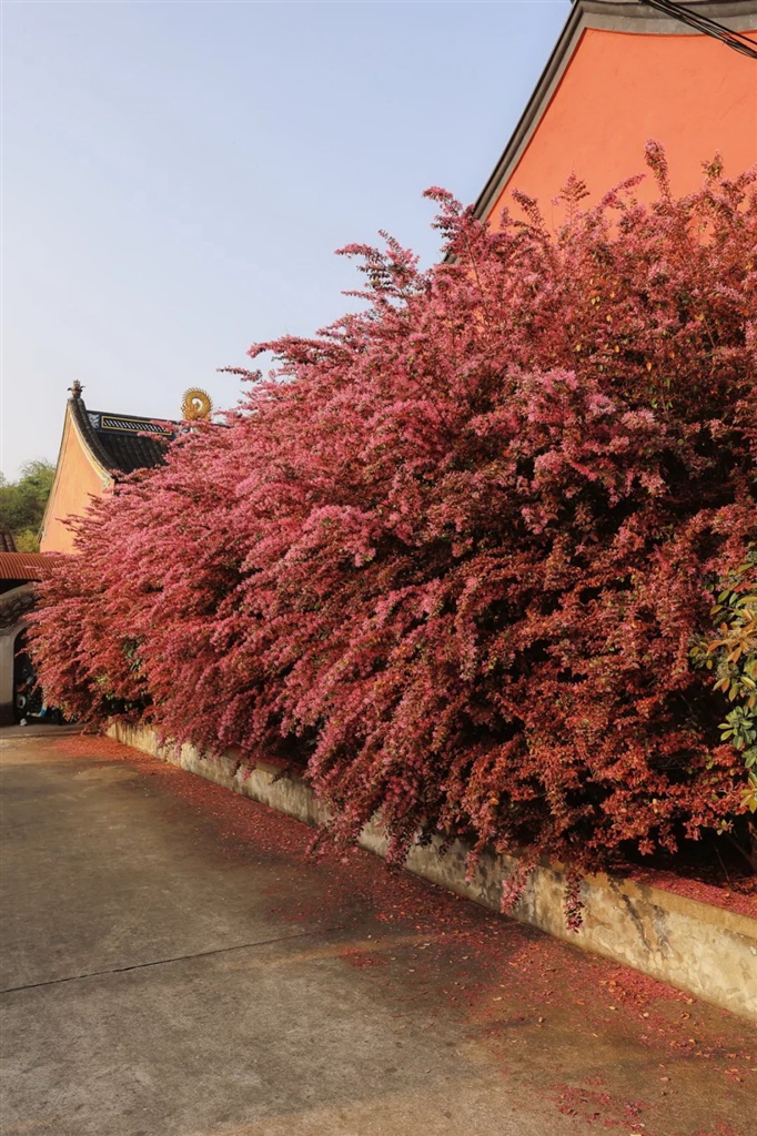 定海盐仓海新村盛开了一墙红花檵木,也成了打卡热门。谁能想到在这里藏着这样一片绝美的花墙。“檵木初开思杳然,因花造字古来鲜”,红花檵木的“檵”(读音为jì)就是专门为这一种植物而造。
