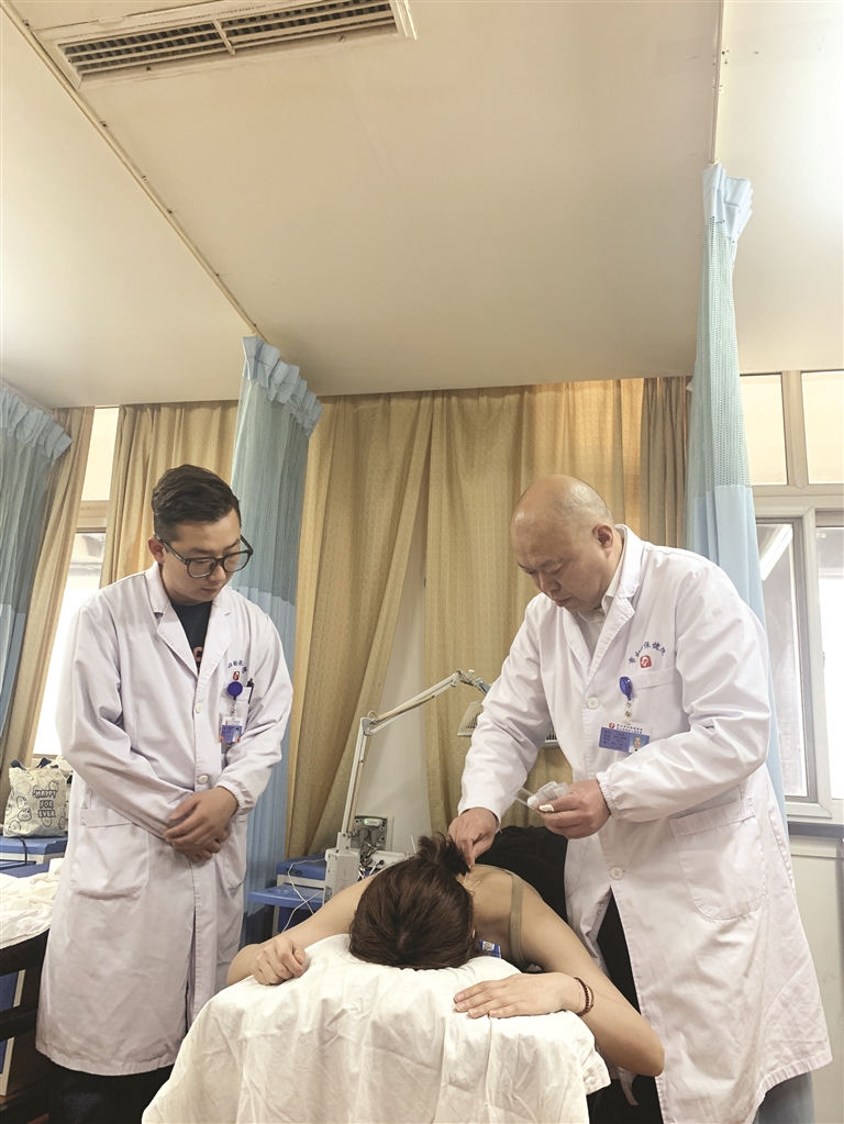 王宏南(右)正在给患者扎针灸 记者 张莉莉 摄