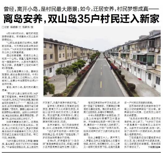 一段时间来,双山岛上的35户老年村民陆陆续续搬到了虾峙岛上。老人们隔海过洋来到新家后,仍然跟熟悉的邻居住在一起,就连原先岛上的“卫生服务站”和“离岛安养服务站”也跟着搬了过来,真是其乐融融(《舟山日报》4月21日报道)。