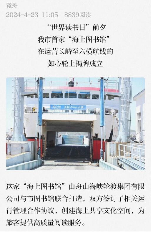 近日,舟山市首家“海上图书馆”在如心轮上正式揭牌成立。这一举措不仅为舟山市民和游客提供了高质量的阅读服务,彰显了城市文化建设的新风貌,也为城市公共文化服务体系的完善增添了新亮点。