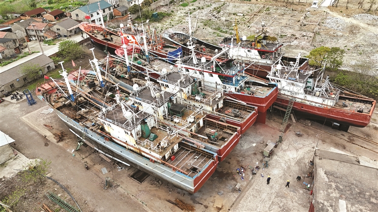 近日,普陀区桃花镇后沙头船舶修造厂,工人们正在为7艘渔船进行渔船钢板更换、机器维修保养、船体防锈漆涂装等工作。船厂内焊花四溅,一派繁忙景象。