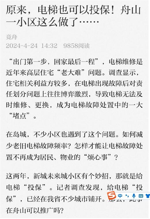 2022年4月,禹洲星城物业联合人保财险舟山分公司,给未来城小区11幢楼的22部电梯投了保。作为试点,未来城也成为我市首个给电梯“投保”的小区。结果,电梯维保优化了,常见问题维修更是由三五天缩短至2小时。这似乎说明,电梯安全除了政府监管之外还需市场化服务保障,如此“两手抓”才能相得益彰。