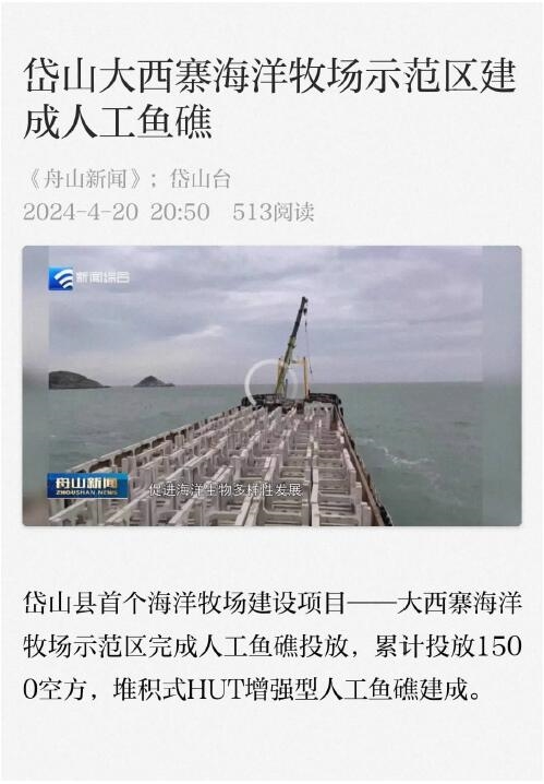 近日,离岱山县长涂镇不远的大西寨岛南面海域上,一艘工程船吊机吊起预制的形似“空心魔方”的人工鱼礁,缓缓投入约12米深的海底……这是在建的岱山县内首个海洋牧场——大西寨海洋牧场示范区,项目总投资1100余万元,建设面积3公顷,投放堆积式人工鱼礁1500个。