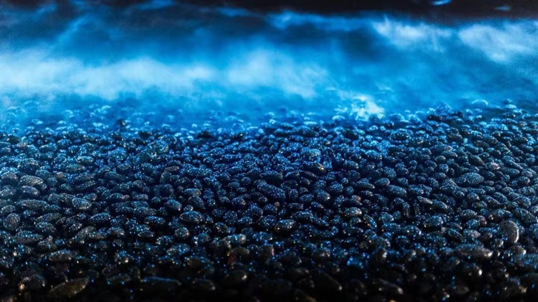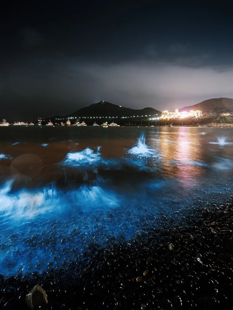 近日,朱家尖乌石塘景区出现唯美浪漫的“蓝眼泪”荧光海景观!一层层的蓝光随波涛起伏,在海浪拍打下,犹如天上的星星坠落于海,美得神秘而浪漫。