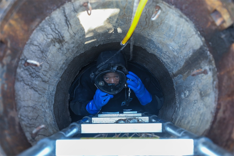 “没问题吧?”在一声声沟通中,赵建彪慢慢地潜入竖井底部,并摸索着进入横井。好在当天水位不高,赵建彪的上半身在水位以上,他潜井中边向前走,边双手摸索寻找管道疑似破损点和渗漏点,10多分钟后上岸,确认这条管道“健康”。上岸脱掉潜水服后,他后背的衬衣已有一片被汗水浸湿。